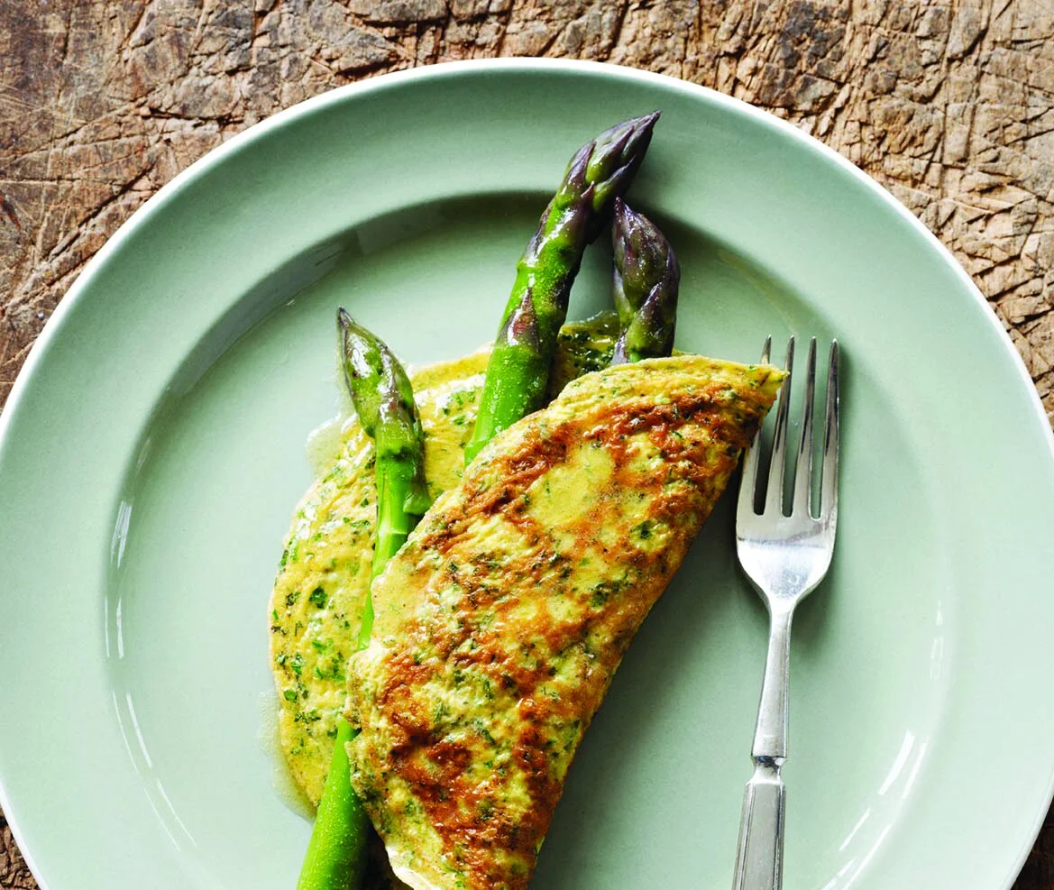 Playing on the classic asparagus served with a poached egg, this makes a great brunch dish served warm or take cold on a picnic. Slightly under-cook the omelettes, as the egg will continue to cook after being removed from the heat. Or you could make one or two large omelettes and cut to serve 4-6 people.